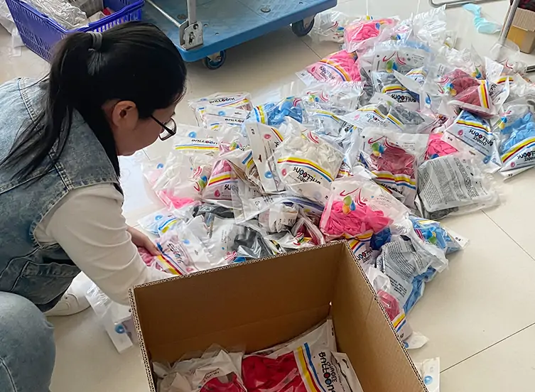 The balloons are counted and packaged according to customer requirements, and a final inspection is conducted to ensure accurate quantity, intact packaging, and the safety and integrity of the product during transportation.