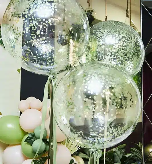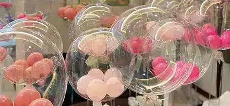 BOBO balloons are highly versatile and widely used in professional balloon décor, retail displays, and customized gift designs. Thanks to their high transparency, flexibility, and smooth surface, bubble balloons can be combined with various decorative elements to create eye-catching and premium visual effects. Below are some of the most popular and practical usage methods in the market.