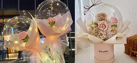 This style is especially popular for birthdays, weddings, baby showers, and luxury gift arrangements. The transparent surface allows the inner elements to stand out clearly, creating a light, elegant, and modern look.