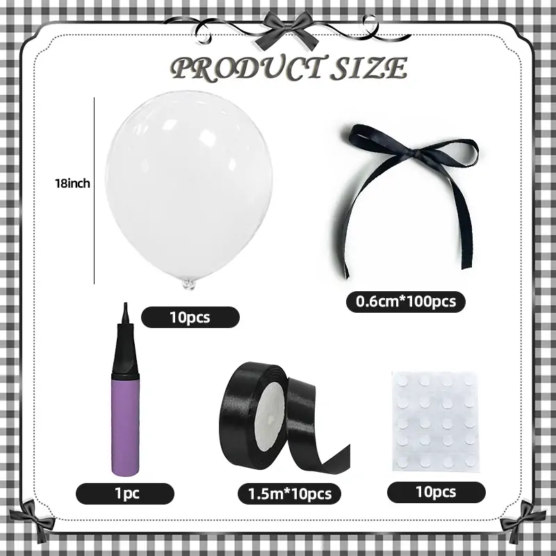 Includes: 10 white balloons, 100 black bows, 10 black ribbons (2cm*1.5m), 10 sheets of adhesive dots, 1 air pump