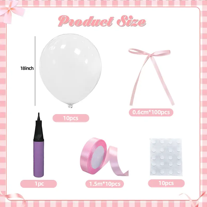 Includes: 10 white balloons, 100 pink bows, 10 pink ribbons (2cm*1.5m), 10 sheets of adhesive dots, 1 air pump