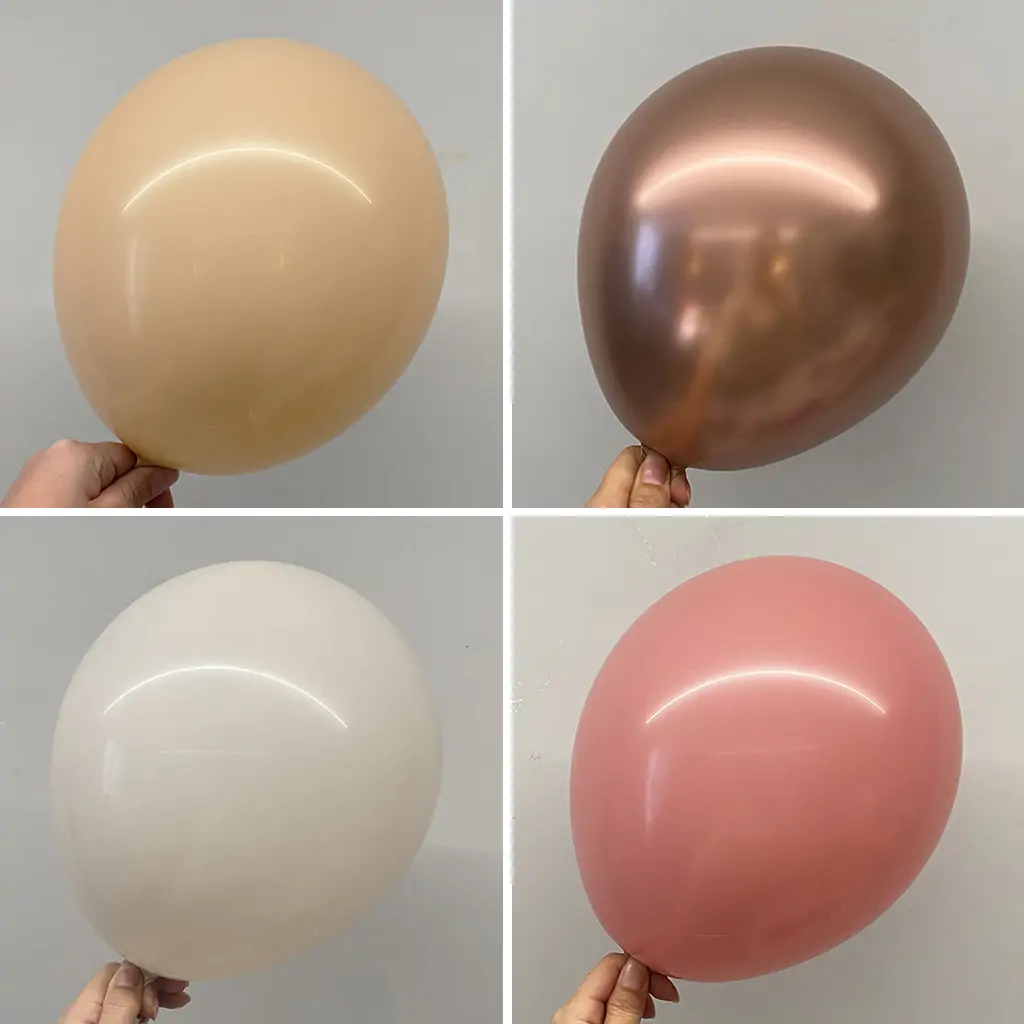 Includes: This set includes 36 metallic rose gold balloons (6 x 12 inches, 15 x 10 inches, and 15 x 5 inches), 38 nude-colored balloons (2 x 18 inches, 6 x 12 inches, 15 x 10 inches, and 15 x 5 inches), 36 sand white balloons (6 x 12 inches, 15 x 10 inches, and 15 x 5 inches), 37 vintage pink balloons (1 x 18 inches, 6 x 12 inches, 15 x 10 inches, and 15 x 5 inches), and 7 rose gold sequined balloons. The set includes all necessary items: a balloon chain, a white ribbon, and 100 adhesive dots.